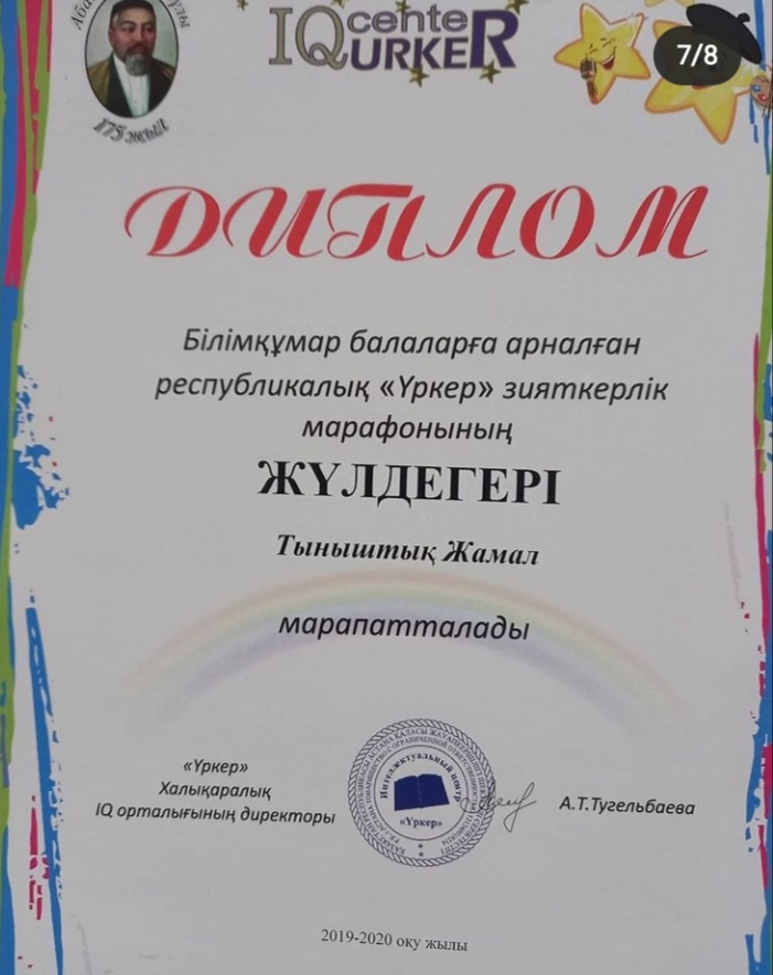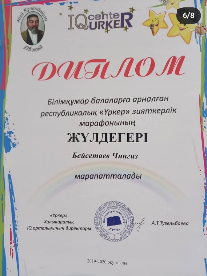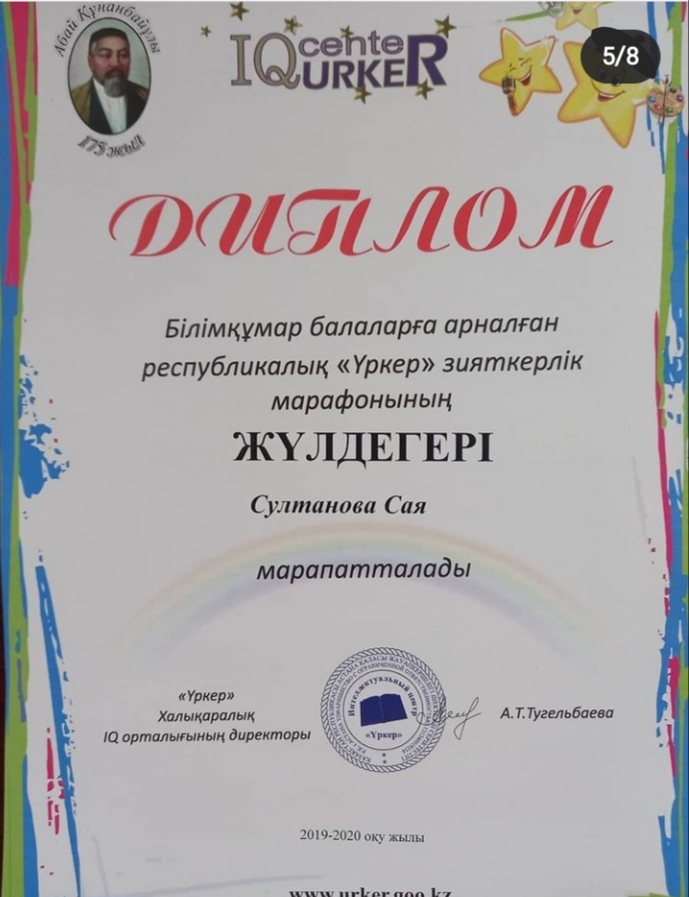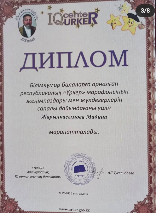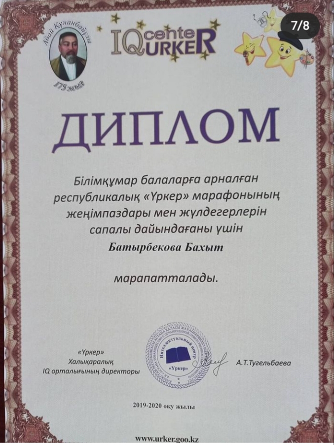 2020ж Республикалық IQ «Үркер» марафонының жеңімпаздарын сапалы дайындаған тәрбиешілерімізбен тәрбиеленушілеріміздің Дипломдары
